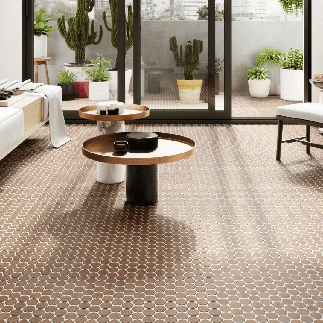 El encanto eterno de la madera con su naturalidad, veteados y matices de color están reflejados en este mosaico de pequeños círculos