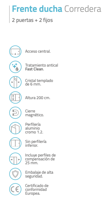 • Un cristal templado de 6mm con tratamiento antical (FASTCLEAN) que permite al usuario disfrutar y mantener las mamparas limpias con un disminuido esfuerzo y consumo de agua  y cierre magnético para que el agua no se disperse.