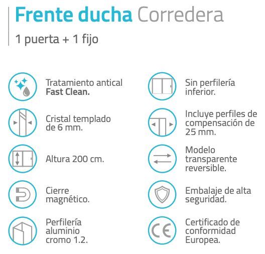 Un cristal templado de 6mm con tratamiento antical (FastCLEAN) que permite al usuario disfrutar y mantener las mamparas limpias con un disminuido esfuerzo y consumo de agua y cierre magnético para que el agua no se disperse.
